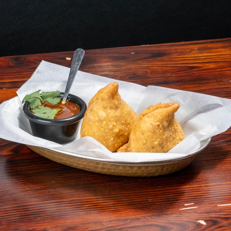 Two Samosas lled with spiced potato, cabbage, green onion, peas wrapped in a thin layer of our dough and fried crisp. Served with tamarind sauce.
